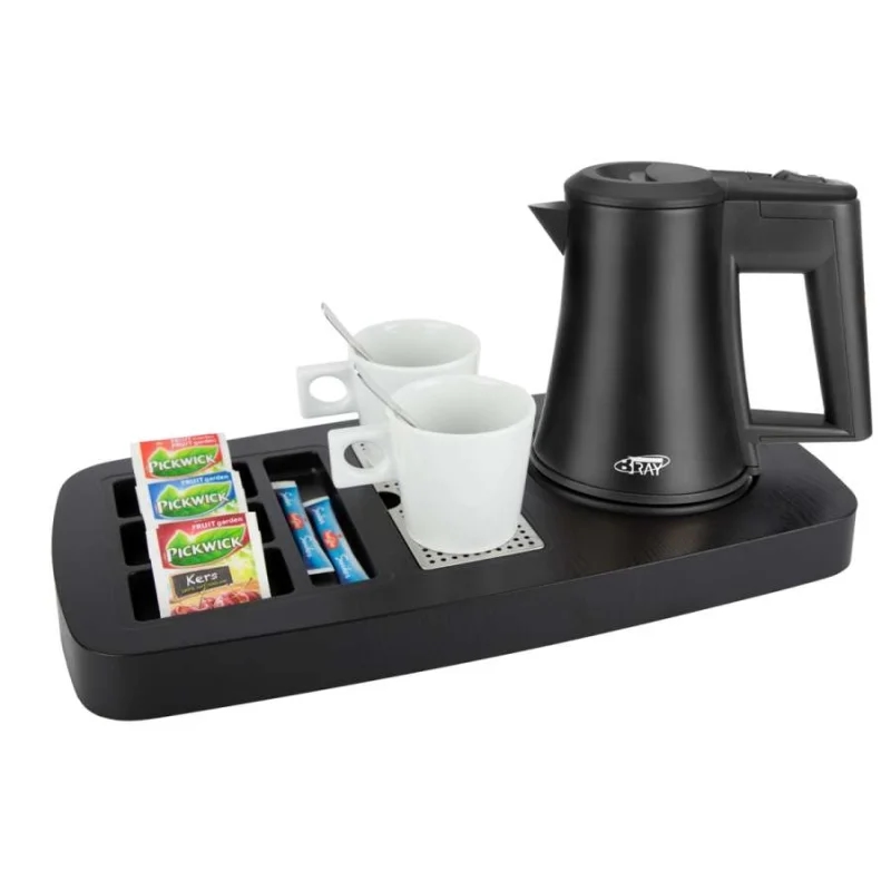 Willkommenstablett SUPREME Schwarz-Braun mit Wasserkocher STAR 0,5 L Schwarz und A5 Prospekthalter
