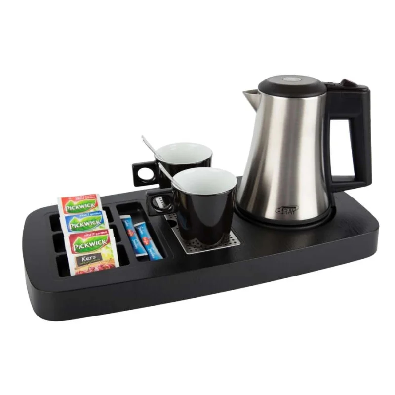 Willkommenstablett SUPREME Schwarz-Braun mit Wasserkocher STYLE 1,0 L Edelstahl und A5 Prospekthalter