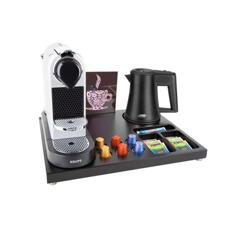 Willkommenstablett SPACE aus Kunstleder Schwarz mit Wasserkocher STAR 0,5 L Schwarz und Kaffeemaschine START
