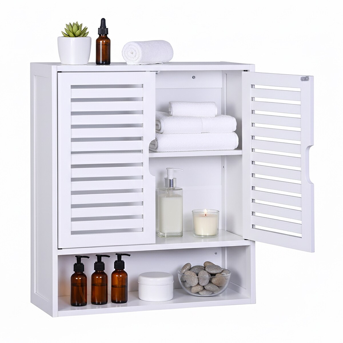 Badezimmerschrank, Wandschrank, Medizinschrank mit verstellbarem Einlegeboden, Lamellentüren und offenem Fach, 20 x 60 x 70 cm, weiß BBC27WT