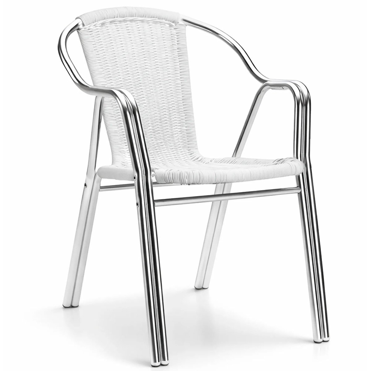 Weiße Stühle aus gebogenem Aluminium mit Geflecht für Terrasse, Bar und Restaurant im Innen- und Außenbereich.