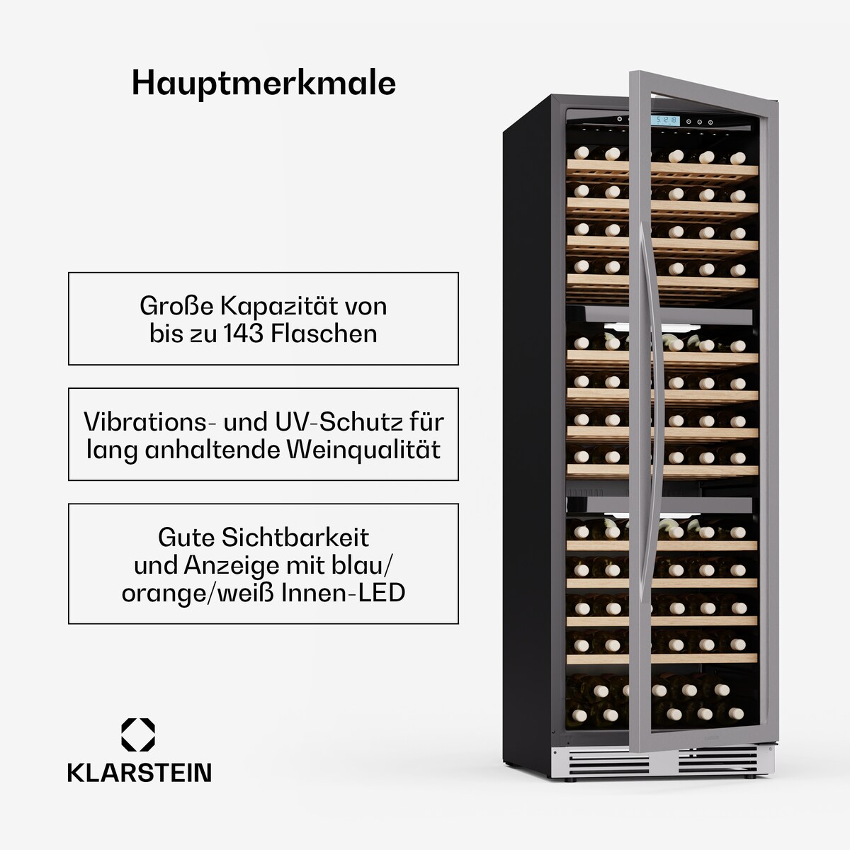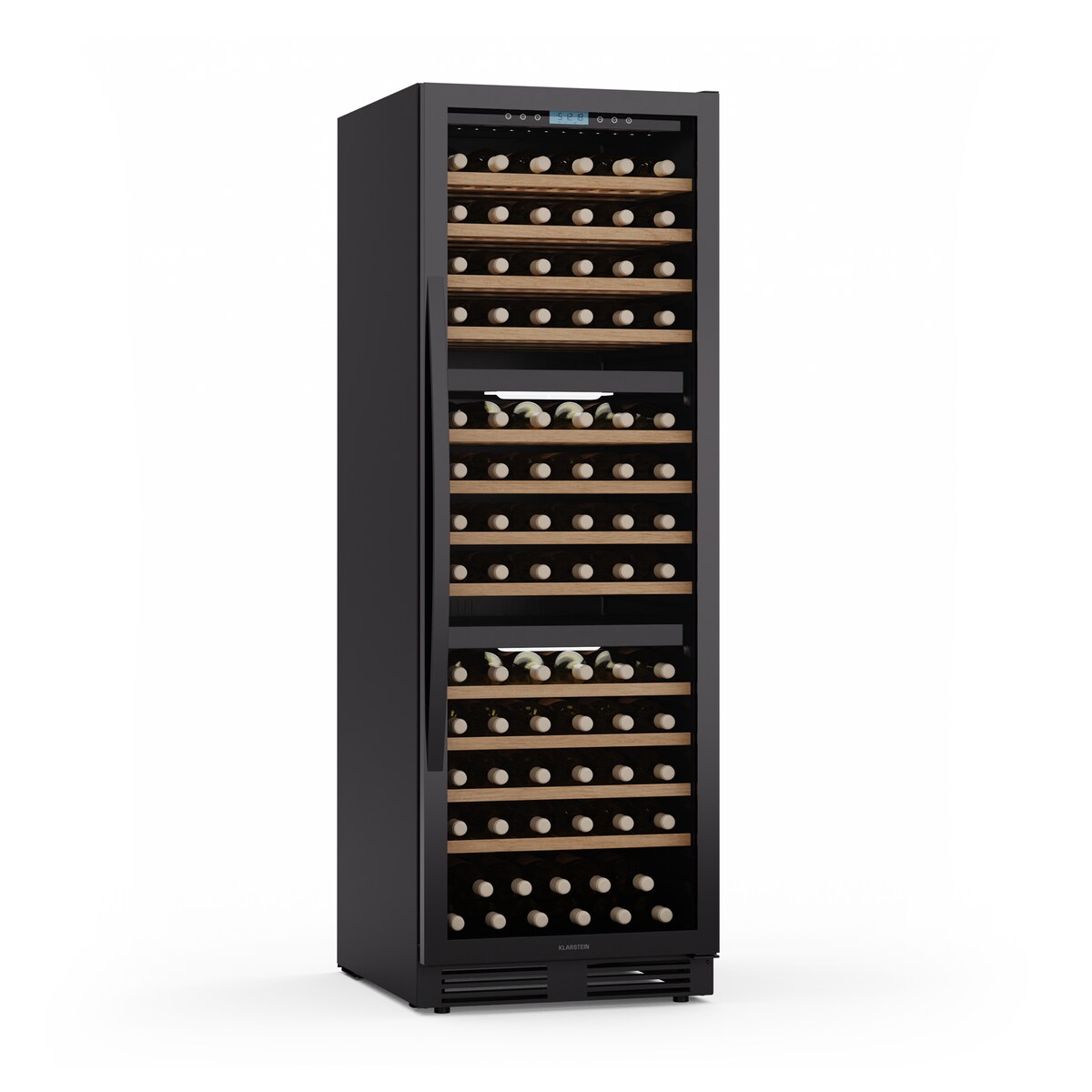 Klarstein Vinovilla Trio Weinkühlschrank – 144 Flaschen, 3 Zonen, 5–20°C, LED-Beleuchtung, UV-Schutz, freistehend, Weinklimaschrank