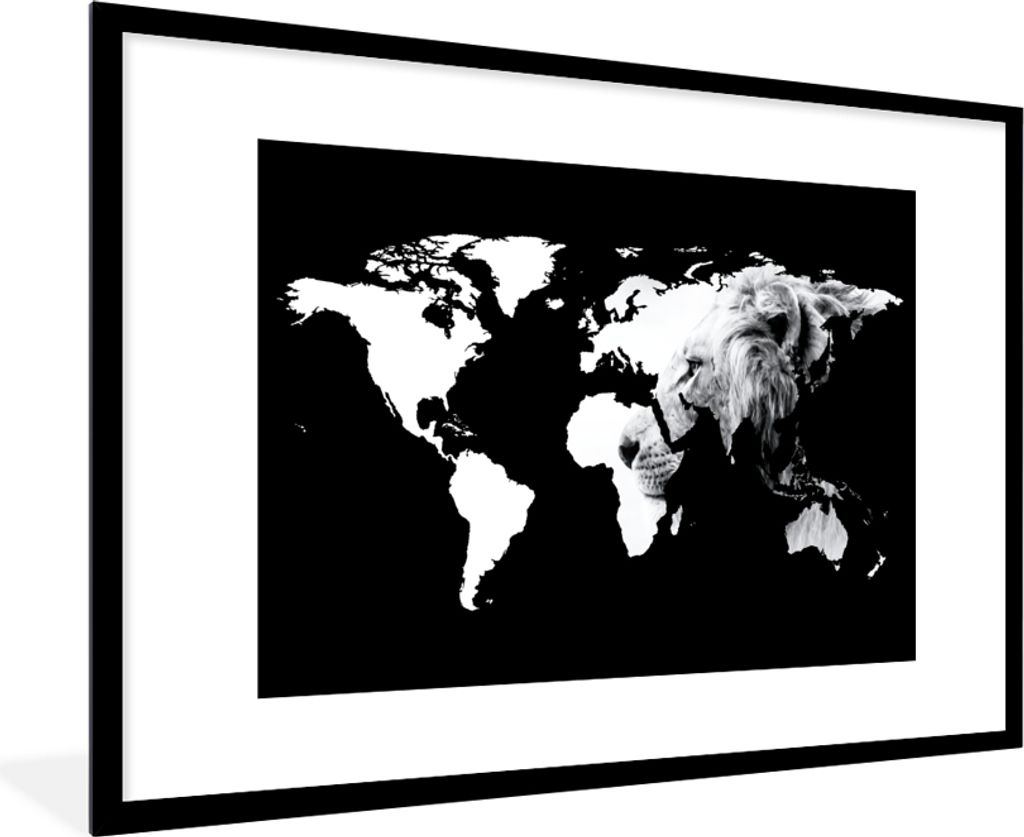 MuchoWow MuchoWow Gerahmtes Poster Weltkarte - Schwarz - Weiß - Löwe 90x60 cm - Poster mit zchwarzem Bilderrahmen - Wanddekoration - Fotos