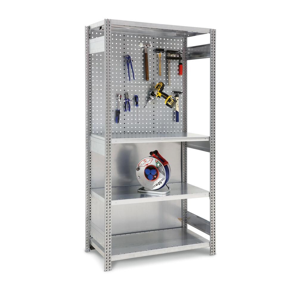 Werkstatt-Regale FALKE Stecksystem | Grundregal | HxBxT 200x101x50cm | 4 Stahlfachboden & Lochblech-Rückwand | Verzinkt