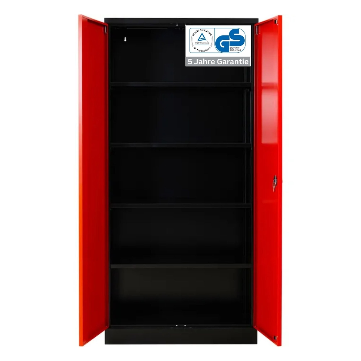 PROREGAL Stahlschrank BEE mit 4 lackierten Fachböden | HxBxT 195x92x42cm | Schwarz-Rot | Werkstattschrank Werkzeugschrank Aktenschrank