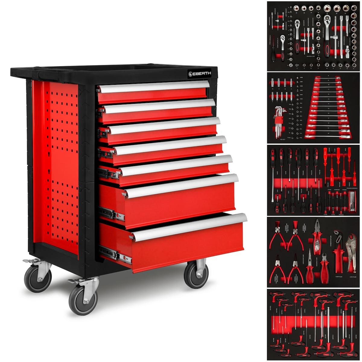 EBERTH Werkstattwagen Rot mit Werkzeug, 7 Schubladen (5 bestückt), abschließbar, kugelgelagert, Lenkrollen, Bremse, pulverbeschichtet