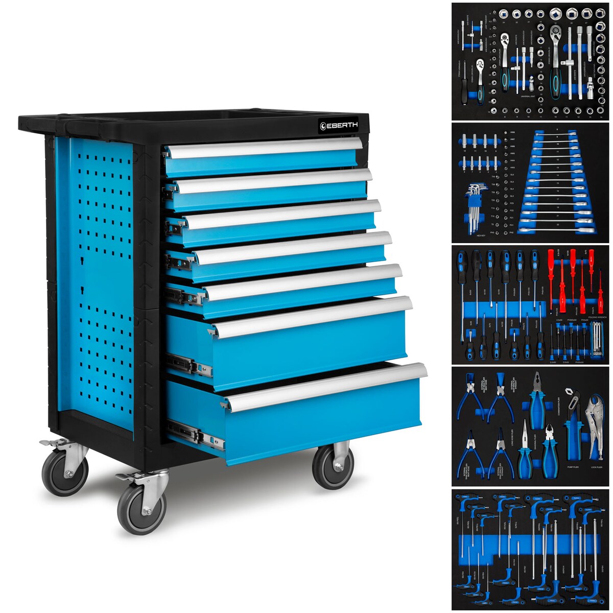 Abschließbarer Werkstattwagen blau mit Werkzeugkasten, Schubladen, Antirutschmatten und Schlüssel