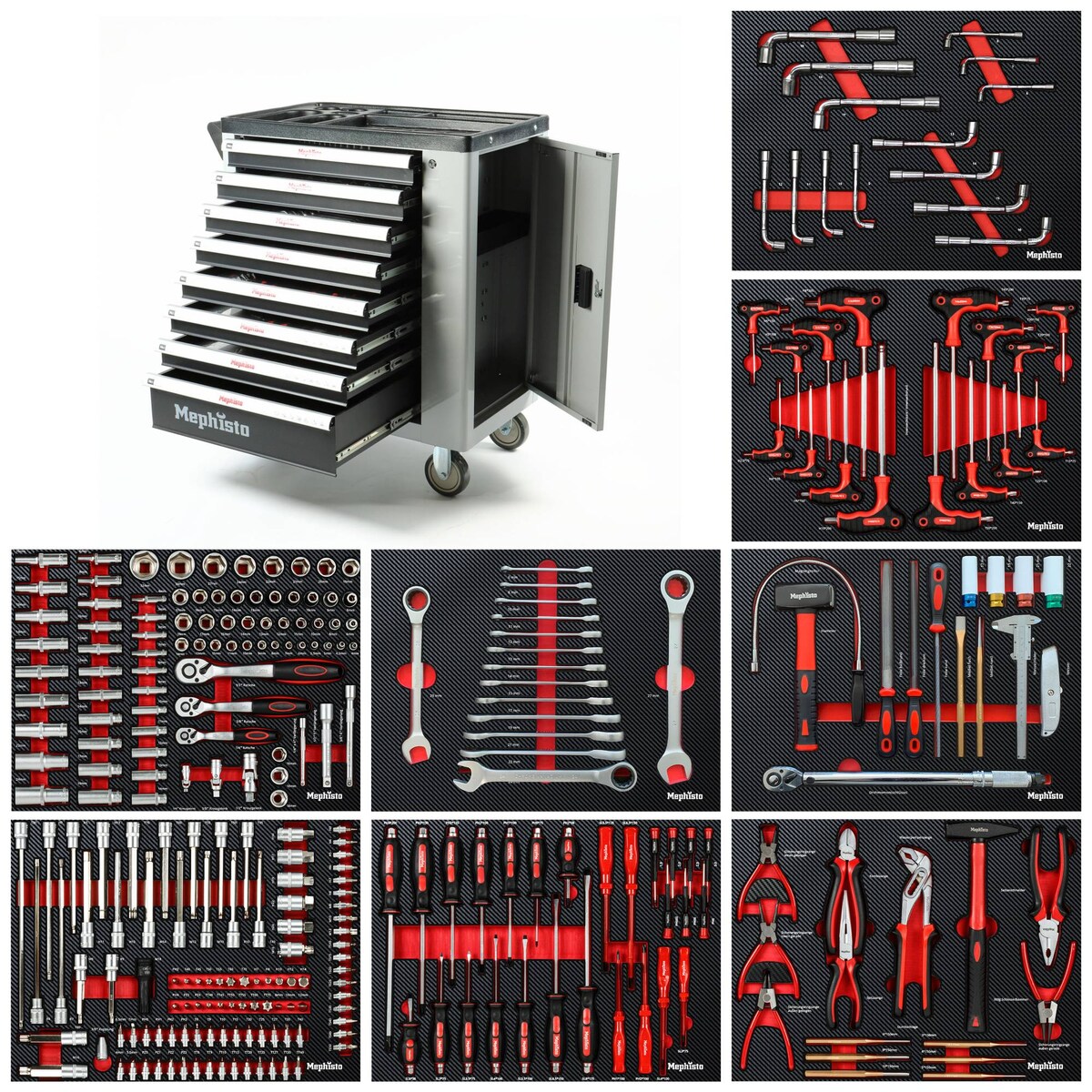 Mephisto Werkzeugwagen Werkstattwagen mit 8 befüllten Schubladen mit Ratsche mit Nusskasten, Pfeifenkopf usw. in Soft Inlays in Carbonoptik