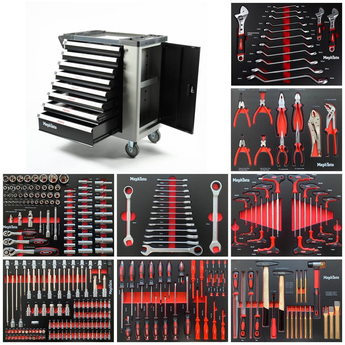 Mephisto Werkzeugwagen Werkstattwagen mit Edelstahlablage und 8 von 8 Schubladen mit Chrom-Vanadium Werkzeug in Soft Inlays mit Carbonoptik