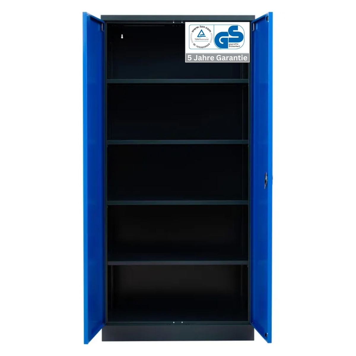 Stahlschrank BEE mit 10 lackierten Fachböden | HxBxT 195x92x42cm | Korpusfarbe Schwarz, Frontfarbe Enzianblau | Werkstattschrank Werkzeugschrank A...