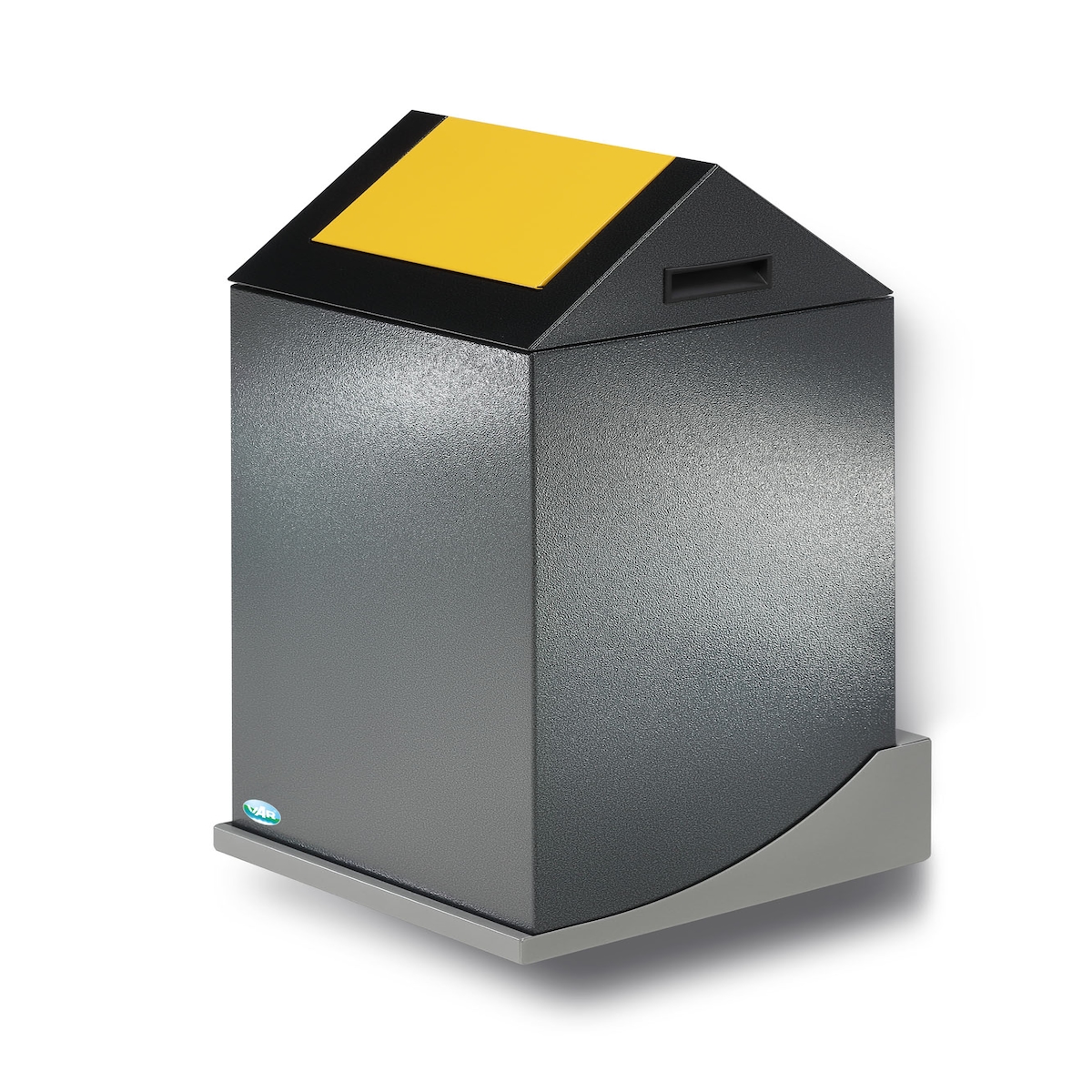 Selbstlöschender Wertstoffsammler spitz mit Einwurfklappe | 89 Liter, HxBxT 104,5x32x32cm | Verzinkter Stahl | Grau-Gelb