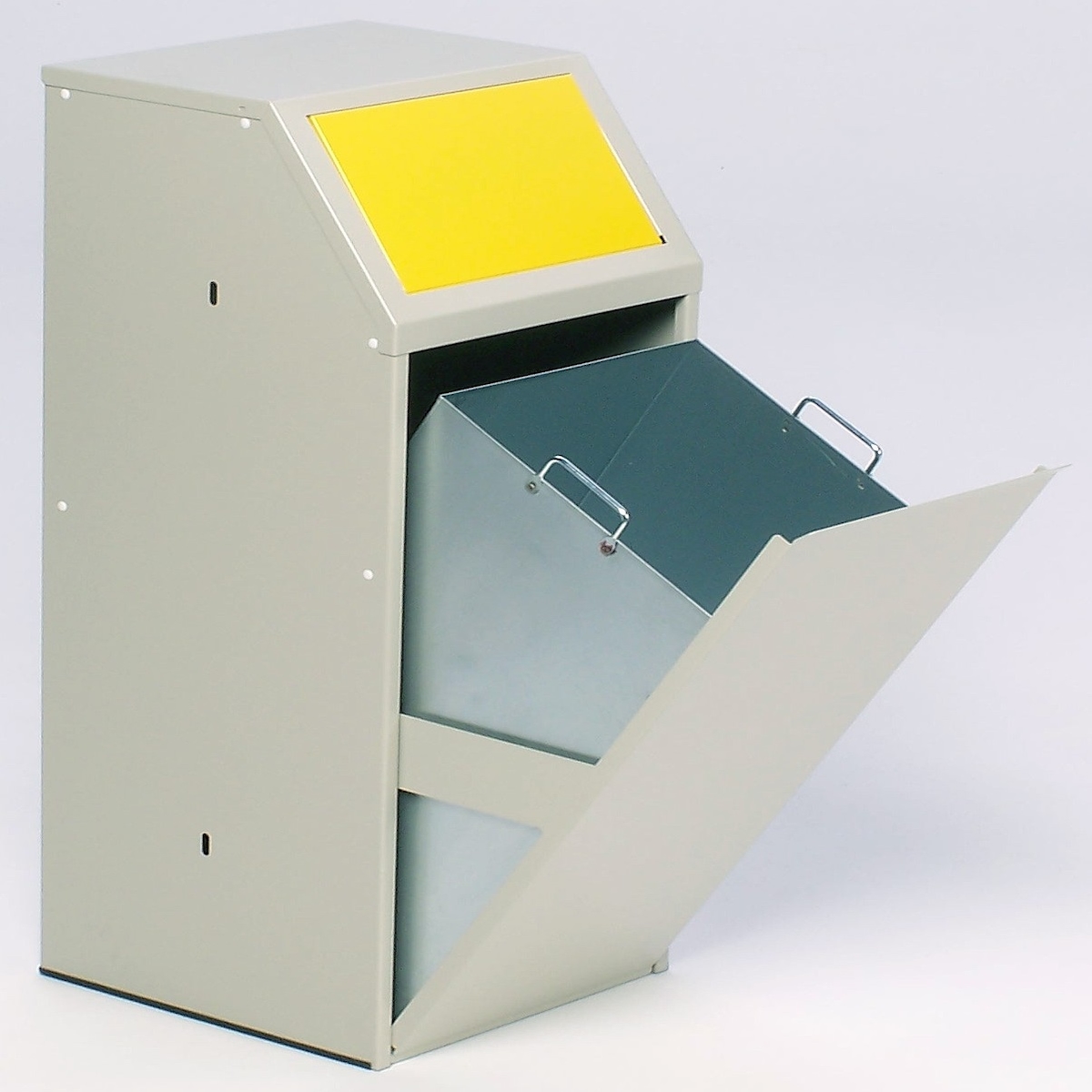 Selbstlöschender Wertstoffsammler rund mit Einwurfklappe | 43 Liter, HxBxT 60x32x32cm | Verzinkter Stahl | Silber-Gelb