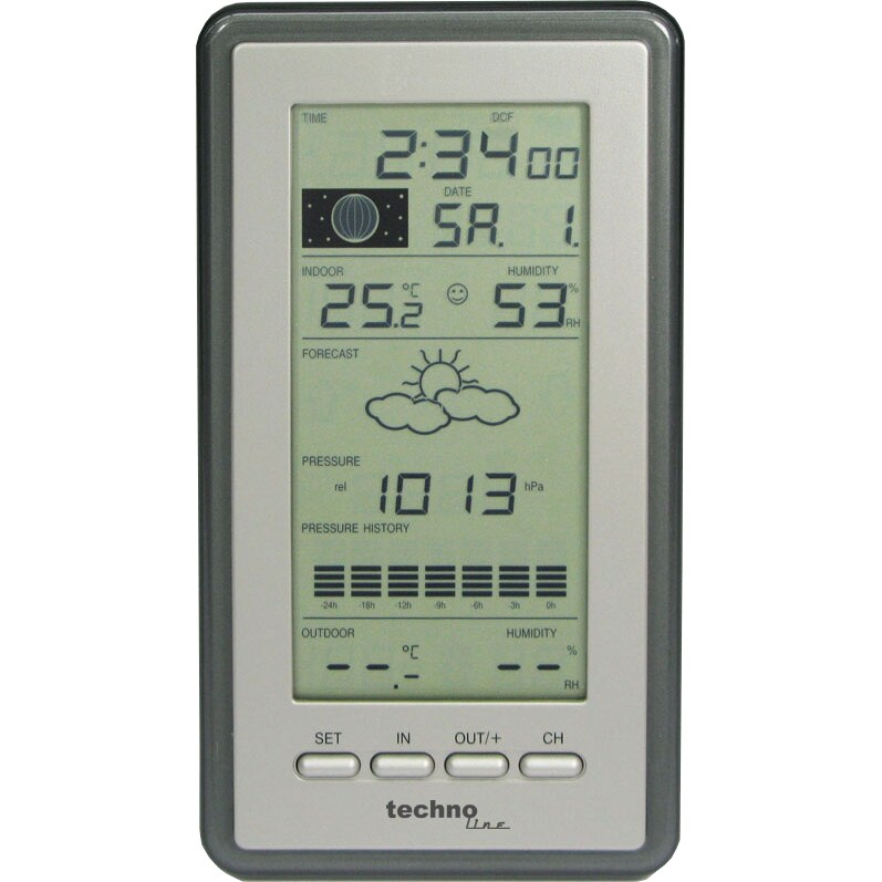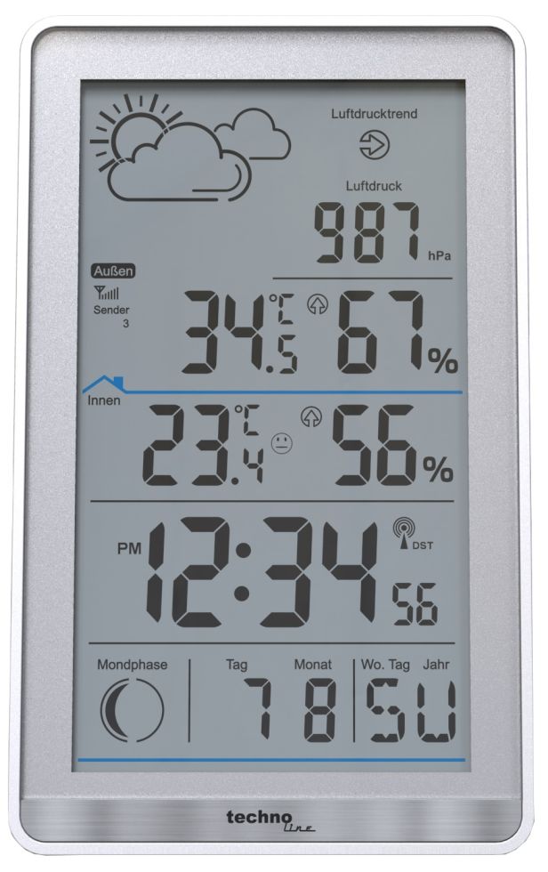 Technoline WD2000 Satelliten Wetterstation mit Außensensor Luftdruck Wettervorhersage silber