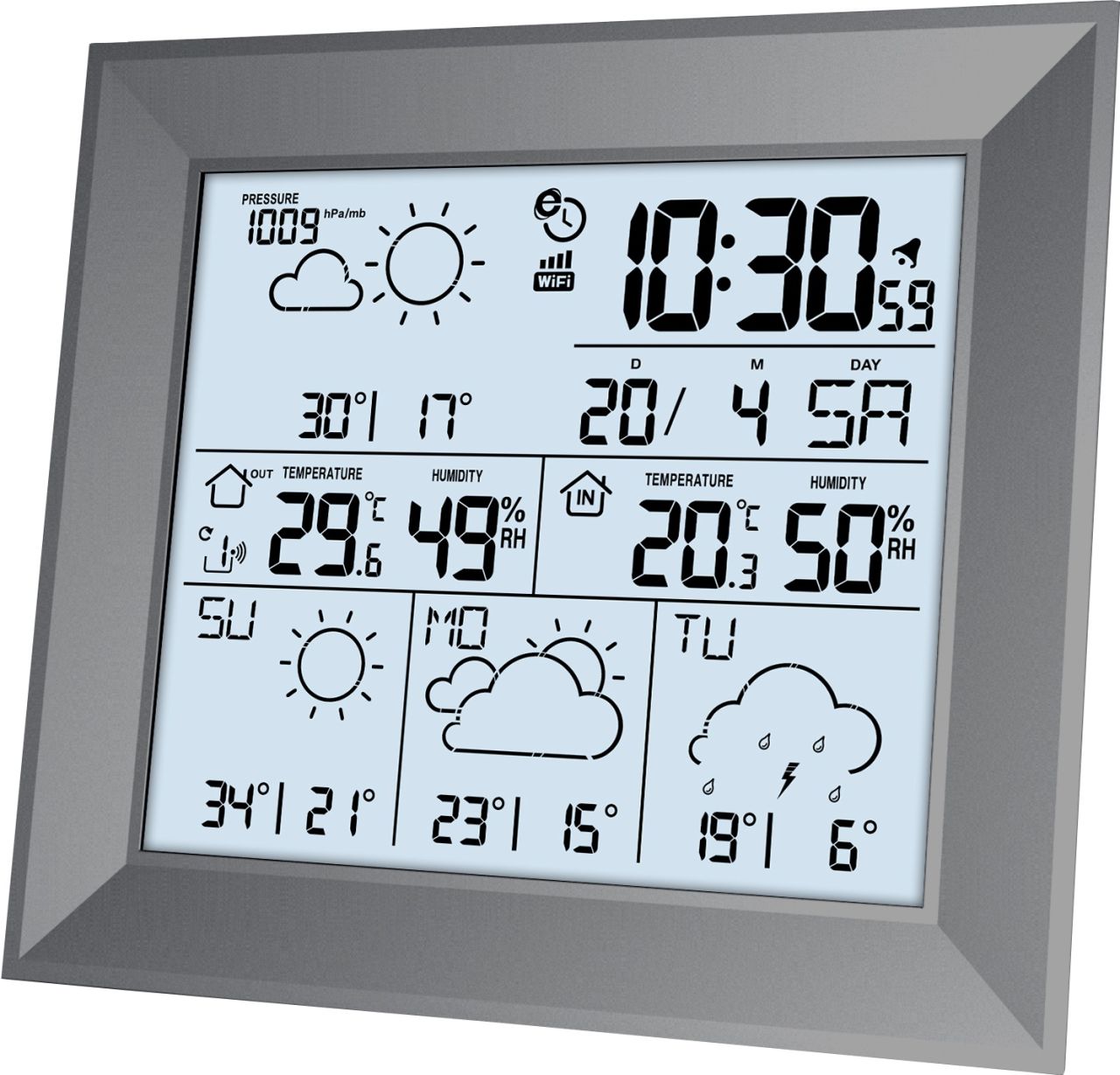 Solight Wetterstation, extra großes Farb-LCD, Temperatur, Luftfeuchtigkeit, Luftdruck, RCC, USB-Ladung, weiß