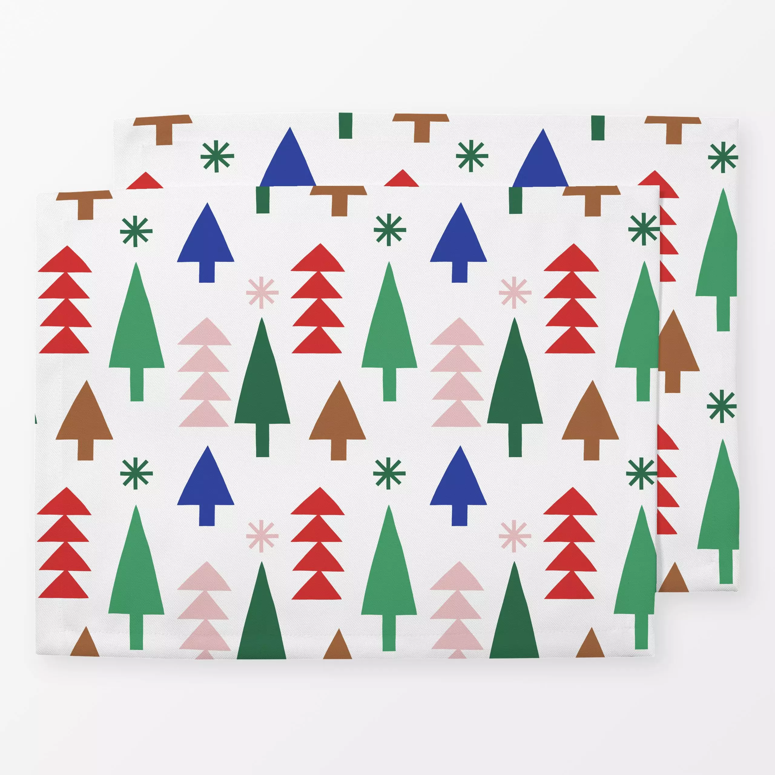 Tischset Colorful Christmas Trees White - Weihnachten, Symbole & Muster - von „Lisa Jasmin Bauer"; Wald, Weihnachtsbaum, Wei...