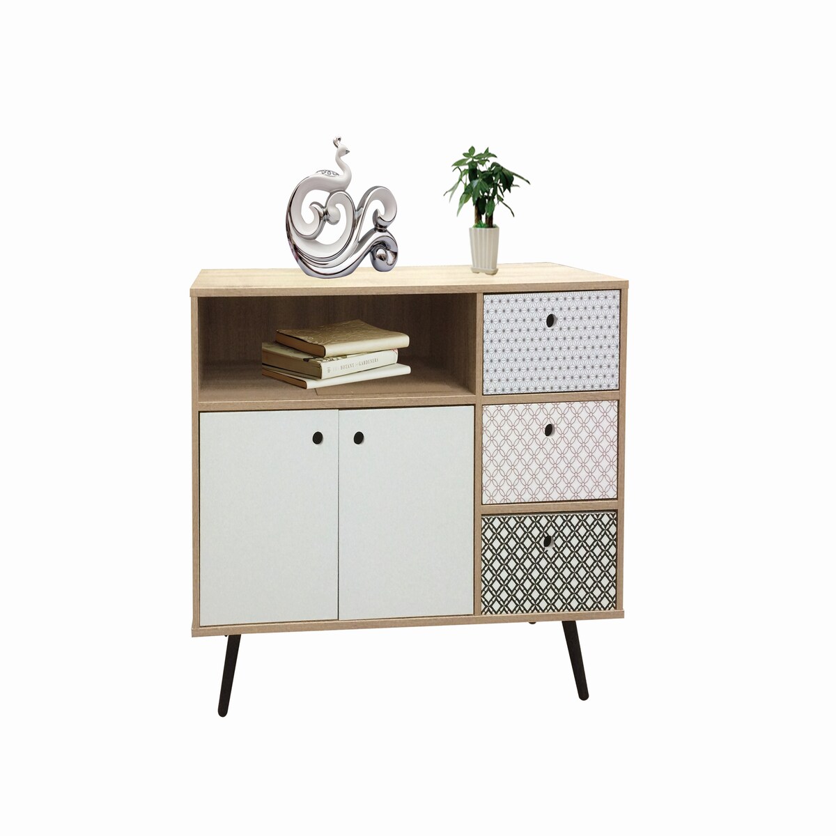 Möbilia Sideboard | 2Türen,3Schubladen,1offenes Fach | MDF mit glatter Nachbildungsfolie|white wash mit blau-weißer Front|B106,5xT39xH77cm|25020095
