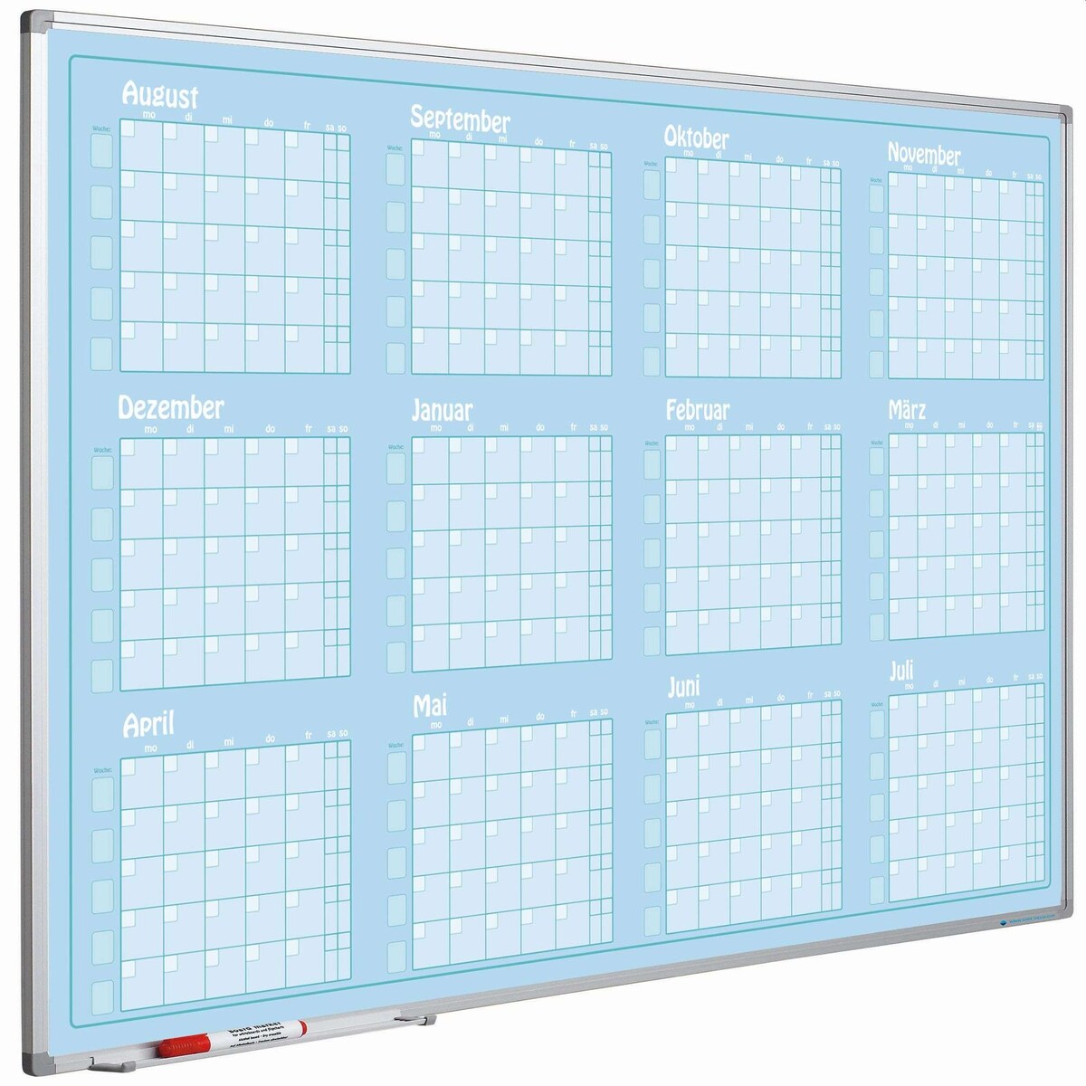 PROREGAL Jahresplaner magnetisches Whiteboard Slim Aug-Jul, HxB 90x120cm, 8mm-Platte, inkl. Befestigungsmaterial & Stiftablage, Lichtblau