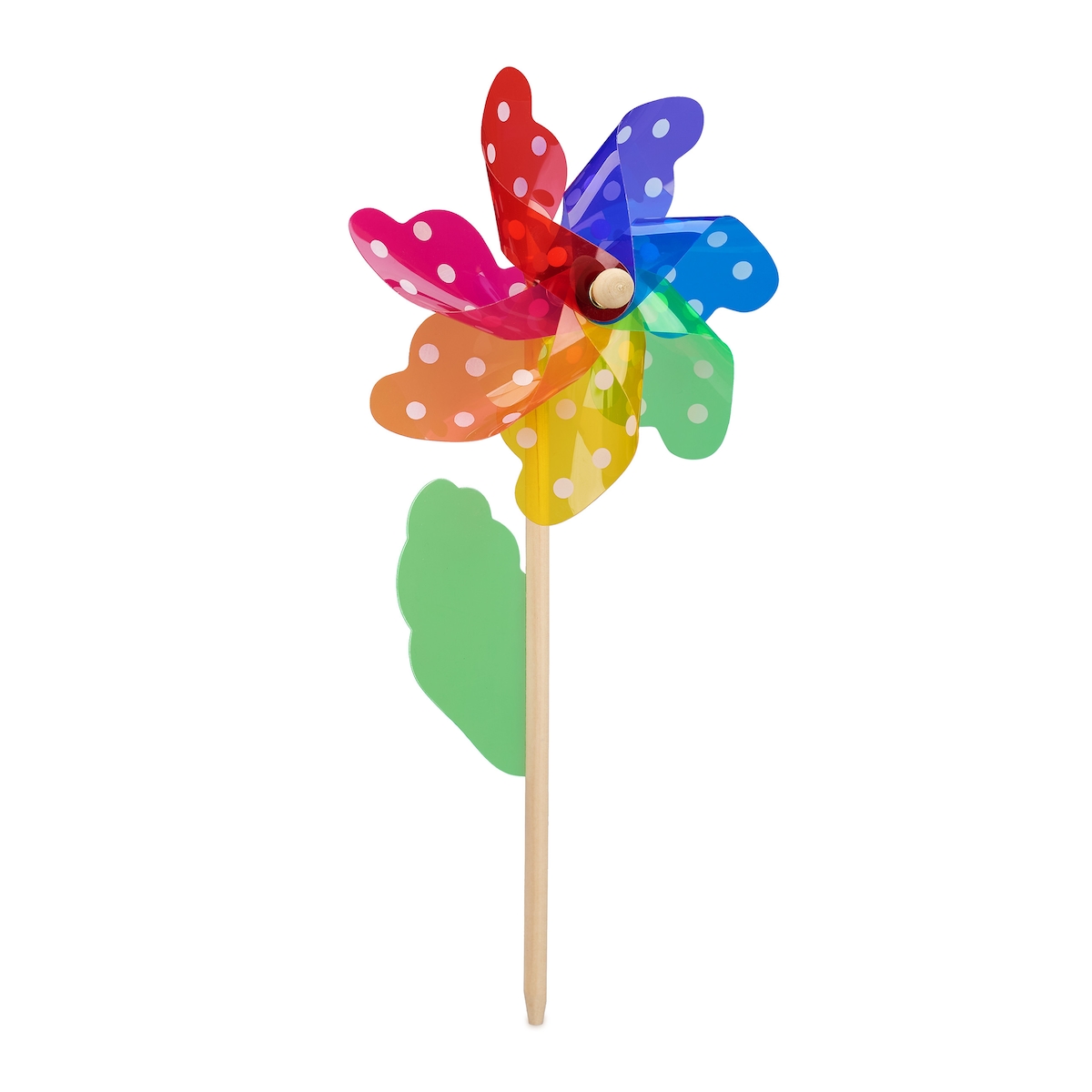 Relaxdays Windrad 2er Set, mit Pünktchennmuster und Dekoblatt, Windmühle für Garten, Balkon & Terrasse, Holz/PP, bunt