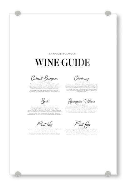 Acrylglasbild "Wine guide to six favorite classics" artboxONE - Typografie,Schwarzweiß,Essen & Trinken / Alkohol