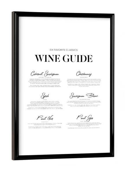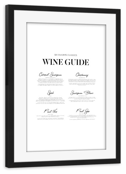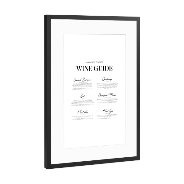 Poster mit Rahmen Schwarz (Metallic) "Wine guide to six favorite classics" artboxONE - Typografie,Schwarzweiß,Essen & Trinken / Alkohol