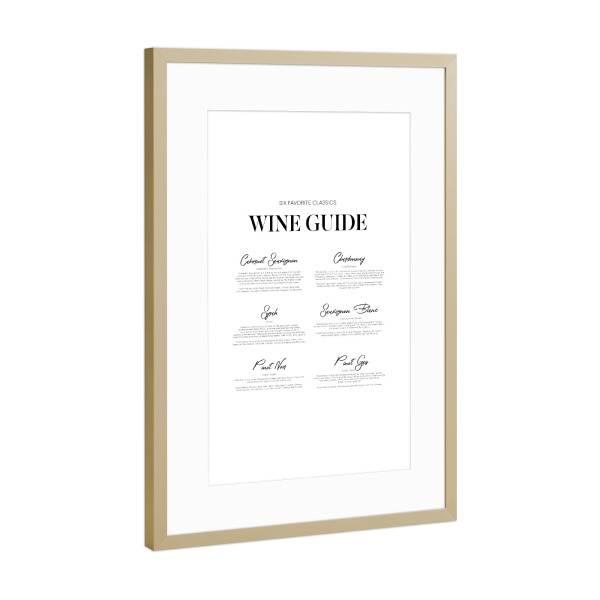 Poster mit Rahmen Gold "Wine guide to six favorite classics" artboxONE - Typografie,Schwarzweiß,Essen & Trinken / Alkohol