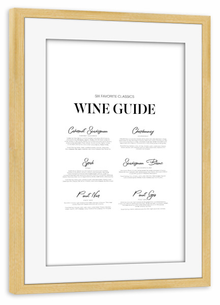 Poster mit Rahmen kiefer "Wine guide to six favorite classics" artboxONE - Typografie,Schwarzweiß,Essen & Trinken / Alkohol