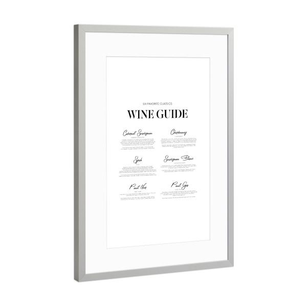 Poster mit Rahmen Silber "Wine guide to six favorite classics" artboxONE - Typografie,Schwarzweiß,Essen & Trinken / Alkohol