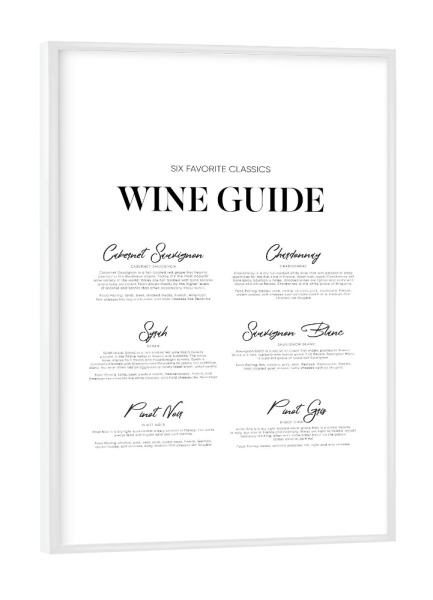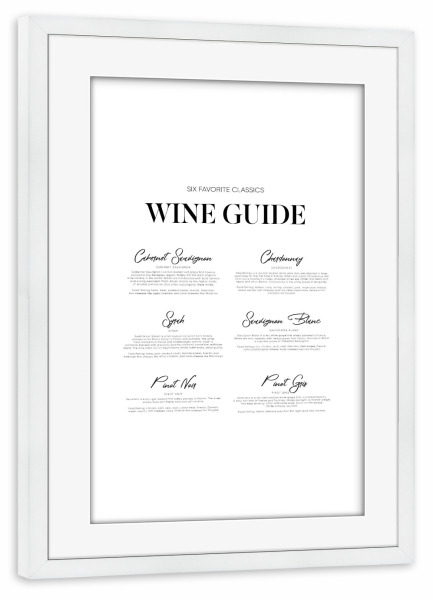 Poster mit Rahmen weiß "Wine guide to six favorite classics" artboxONE - Typografie,Schwarzweiß,Essen & Trinken / Alkohol