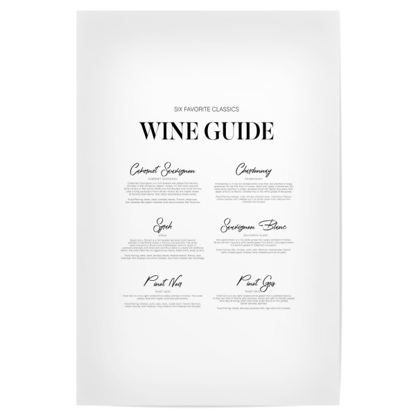 Poster 30x20 cm "Wine guide to six favorite classics" artboxONE - Typografie,Schwarzweiß,Essen & Trinken / Alkohol