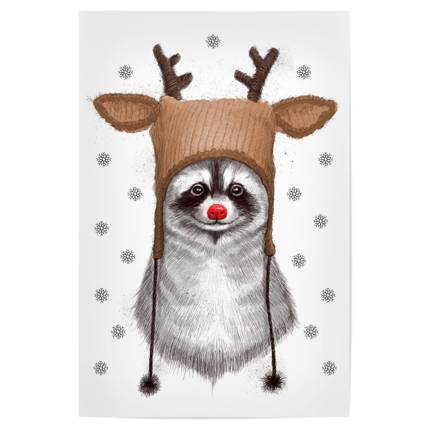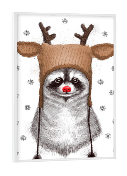 Poster mit weißem Rahmen "Raccoon in Deer Hat" artboxONE - Natur,Tiere - Waschbär,Tier,Weihnachten,Hirschhut,Winter,Schnee,Kinder