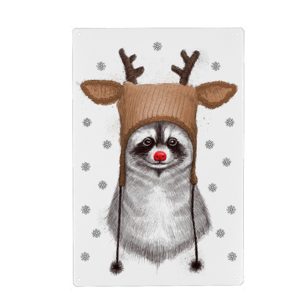 Metall Poster "Raccoon in Deer Hat" artboxONE - Natur,Tiere - Waschbär,Tier,Weihnachten,Hirschhut,Winter,Schnee,Kinder - Blechschild