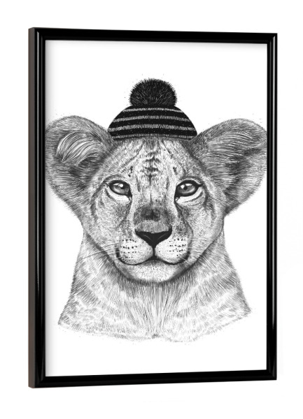 Poster mit schwarzem Rahmen "Kid lion in winter hat" artboxONE - Tiere,Schwarzweiß,Weihnachten,Lustig