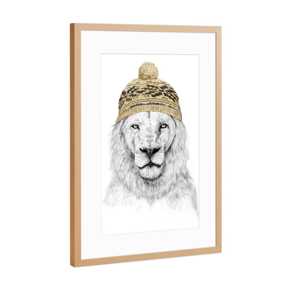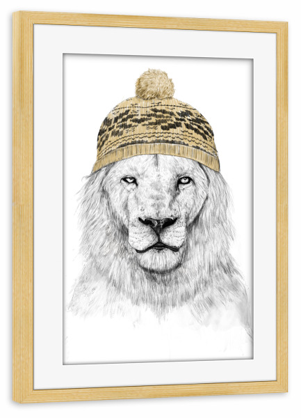 Poster mit Rahmen kiefer "Winter lion" artboxONE - Tiere,Lustig - Lion,Animal,Hat,Winter
