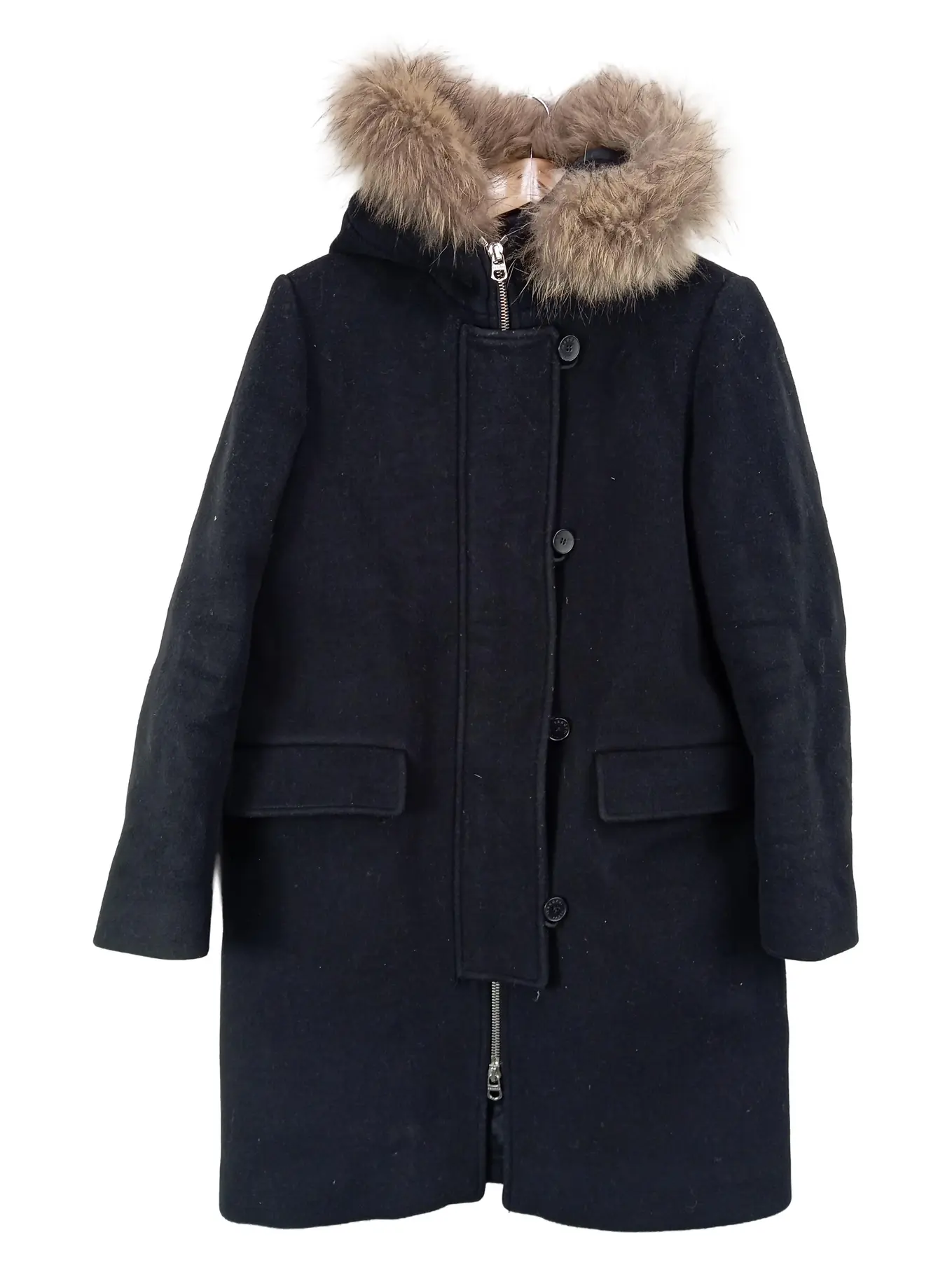 SANDRO Damen Wintermantel 40/L Schwarz Wolle Kapuze Fellbesatz Elegant