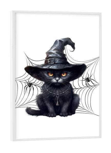 Poster mit Rahmen weiß "Spooky Black Cat Witch Hat" artboxONE - Tiere,Festivals,Halloween