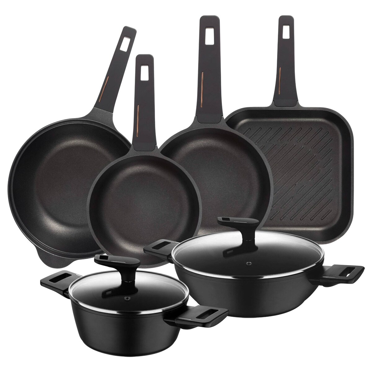 BERGNER Copper - Set: Kasserollen Ø20/28cm geschmiedet Aluminium, Pfannen Ø24/28cm, Grillpfanne 28×28cm & Wok Ø30cm gegossen Aluminium