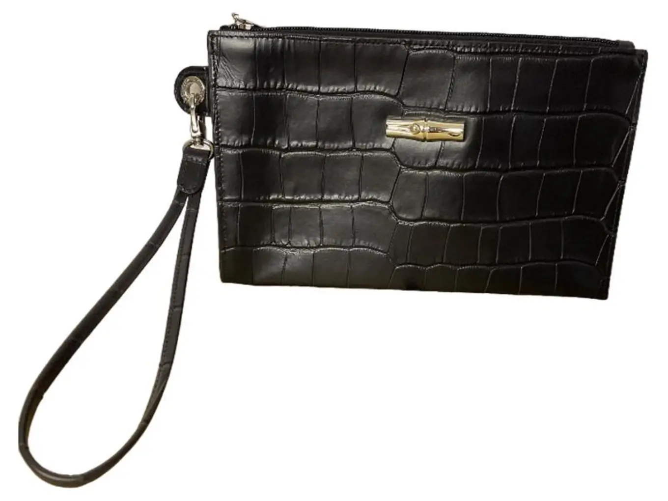 LONGCHAMP Clutch Damen Leder Krokoprägung Schwarz Roseau Wristlet