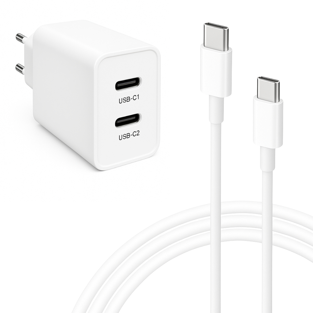 45W GaN USB-C Ladegerät mit 2× USB-C + 1 m 60 W Kabel – Schnellladen für iPhone 15 / 16 / 17, Samsung, Huawei, Xiaomi, Tablet – Weiß