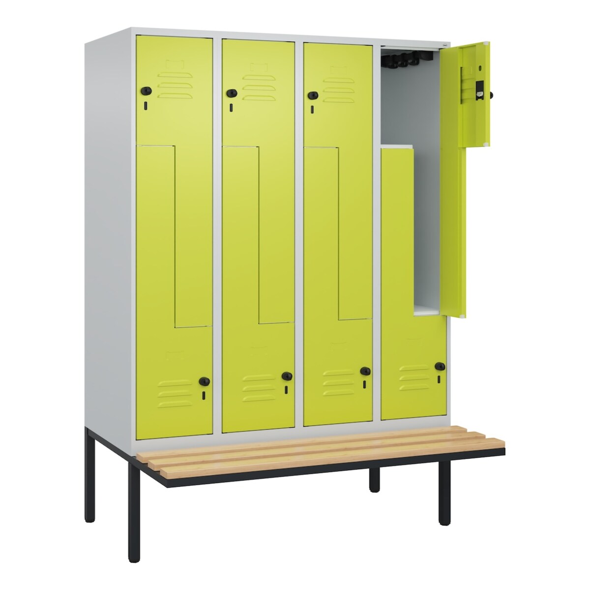 C+P Z-Spind Classic PLUS, Bank, 4 Fächer, 2120x600x815mm, 7035/6011 Verschluss Zylinderschloss Sitzbanktyp auskragend Material Sitzfläche Buche-Hartho