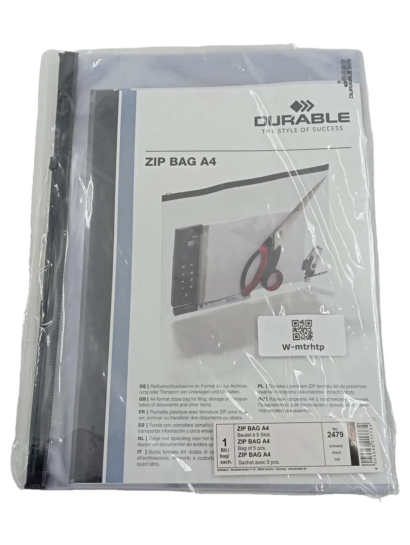 DURABLE ZIP BAG A4 Reißverschlusstasche 5 Stück Schwarz Transparent