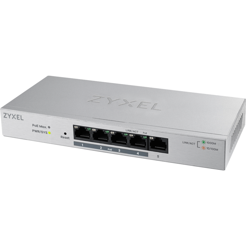 ZYXEL GS1005HP Unmanaged Switch Zyxel 5-Port Gigabit Switch mit 4 x PoE+, 60-Watt-PoE-Budget, lebenslange Garantie